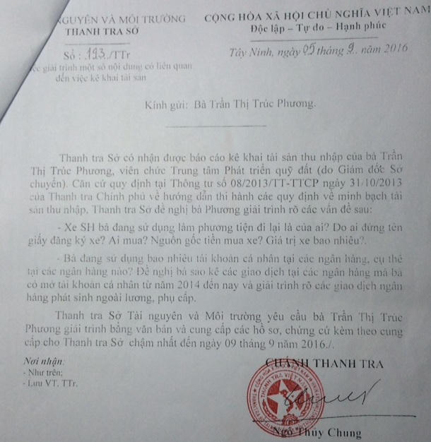 Câu chuyện bắt đầu khi ông Ngô Thủy Chung - Chánh Thanh tra Sở TN&MT ký văn bản số 193/TTr ngày 05/9/2016 để yêu cầu bà Phương giải trình một số nội dung liên quan đến việc sử dụng xe SH, kê khai các tài khoản ngân hàng…