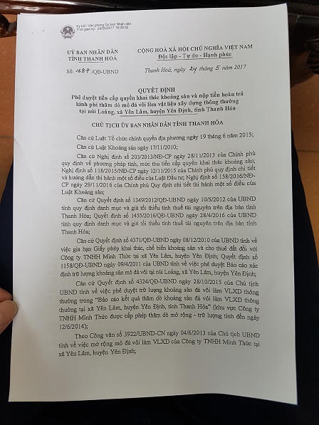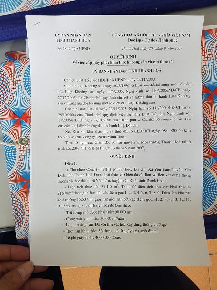 Theo như tài liệu mà Phòng Tài nguyên khoáng sản (Sở Tài nguyên và môi trường tỉnh Thanh Hóa) cung cấp cho phóng viên, ngày 20/9/2007, UBND tỉnh Thanh Hóa đã ra quyết định số 2847/QĐ-UBND về việc cấp giấy phép khai thác khoáng sản và cho thuê đất đối với Công ty TNHH Minh Thức với thời hạn 36 tháng. Trong đó, diện tích thuê đất là 37.115 mét vuông, diện tích khai thác là 21.578 mét vuông, diện tích khai trường là 15.537 mét vuông.