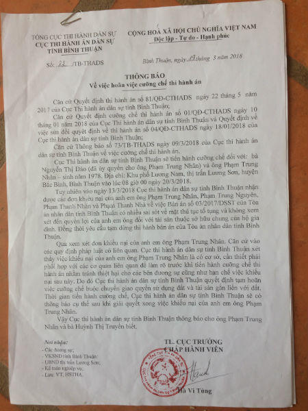 Ngày 19/3/2018, chỉ một ngày trước khi diễn ra việc cưỡng chế như đã thông báo, Cục Thi hành án dân sự (THADS) tỉnh Bình Thuận ra Thông báo số 82/TB-THADS về việc hoãn việc cưỡng chế đối với bà Nguyễn Thị Đào, ông Phạm Trung Nhân.