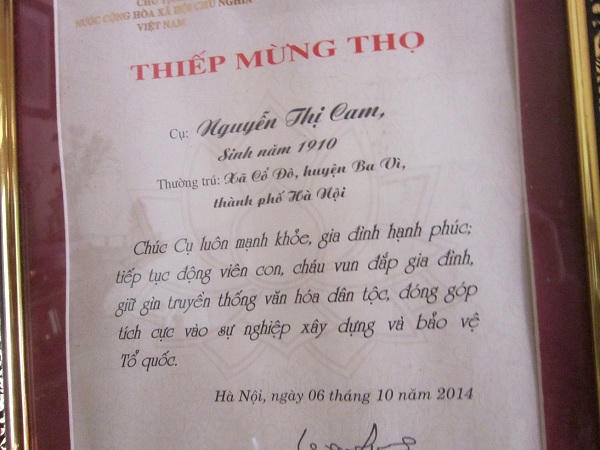 Bà Hà, một người bán rau nhanh nhẹn trả lời: “Tôi sống cùng thôn với cụ Cam. Miền quê này nghèo lắm, chúng tôi quanh năm bán mặt cho đất bán lưng cho trời nhưng nhờ có không khí trong lành nên trong thôn cũng có một số cụ trên dưới trăm tuổi nhưng cụ Cam là cao tuổi nhất. Các cụ khác còn yếu chứ cụ Cam vẫn nhanh nhẹn, hoạt bát và giúp con cháu được nhiều việc lắm. Đặc biệt, cụ còn là kho văn thơ, ca dao truyền thống đấy”.