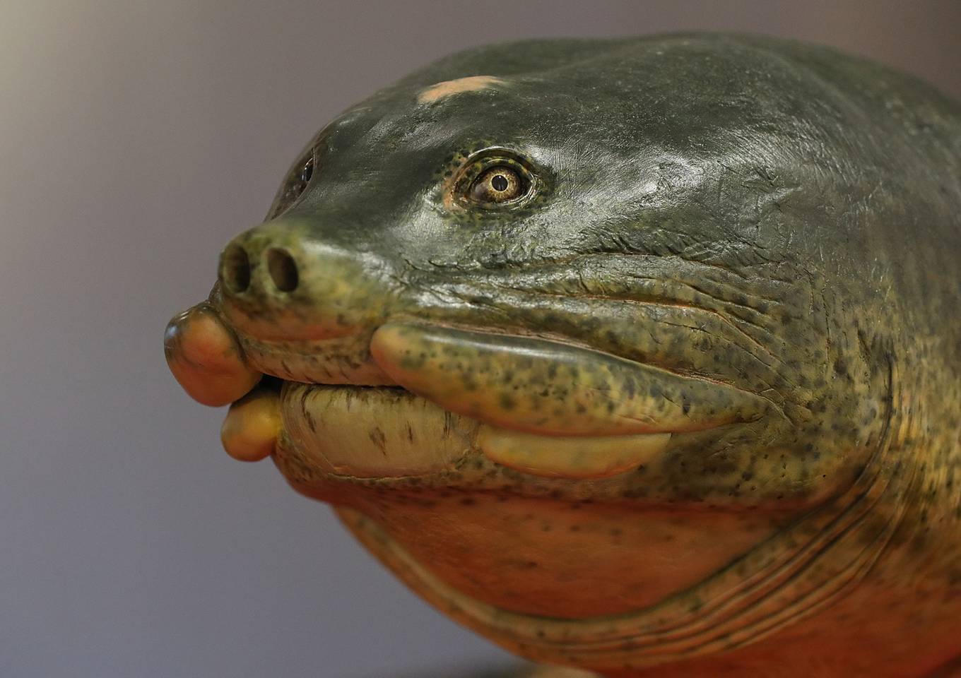 Tư thế phía trước của tiêu bản rùa Hồ Gươm. Việc trưng bày tiêu bản đòi hỏi môi trường không có bụi bẩn, nấm mốc và cần được theo dõi, ghi chép hàng ngày để phát hiện hư hỏng để xử lý kịp thời.