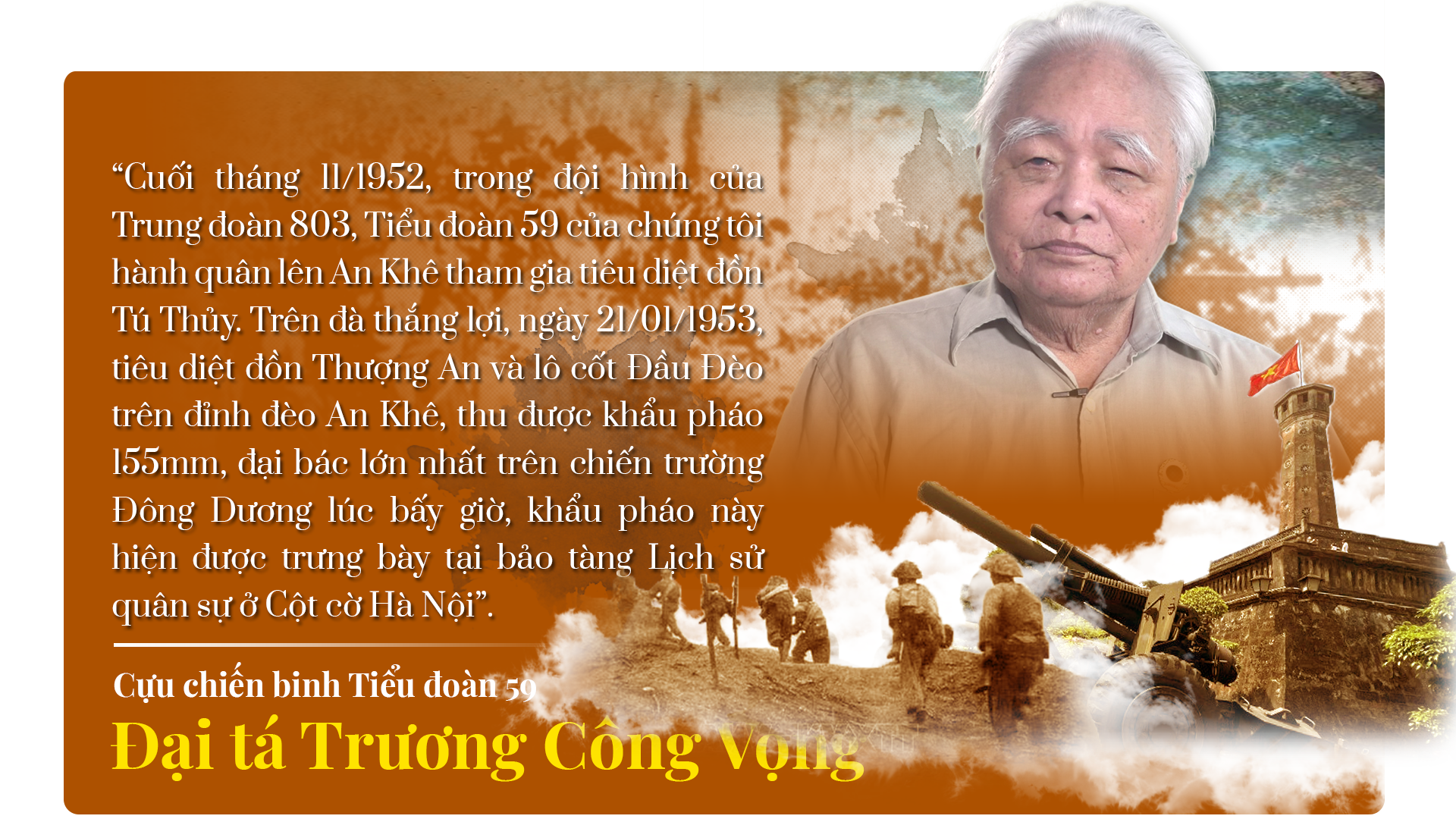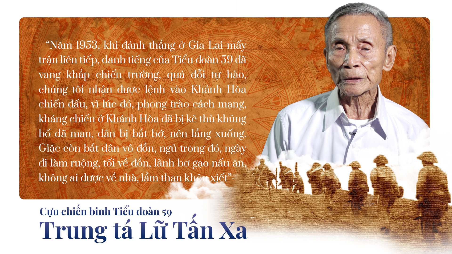 Ông Lê Vĩnh Đề, một cựu chiến binh Tiểu đoàn 59 không giấu được sự xúc động khi nhớ lại những ngày tháng hào hùng cách đây 7 thập niên: "Tháng 9 năm 1945, tôi tham gia nhập ngũ, ở Đại đội độc lập của Quảng Nam – Đà Nẵng, tham gia nhiều trận đánh. Đến năm 1950, Bộ Tư lệnh Liên khu yêu cầu thành lập một đơn vị chủ lực cơ động, huấn luyện lối đánh đặc biệt để có thể thọc sâu vào sau lưng địch, tiêu diệt những mục tiêu được xây dựng kiên cố, có hỏa lực mạnh. Tôi được điều về Tiểu đoàn 59, đúng ngày thành lập đơn vị.
