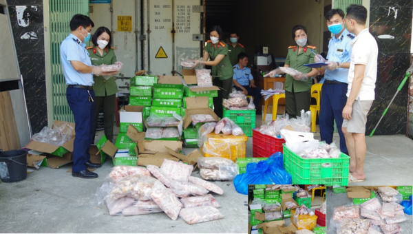 Tại thời điểm kiểm tra, lực lượng chức năng phát hiện trong kho lạnh của hộ kinh doanh trên có 511,5kg thực phẩm gồm: Tràng lợn, đuôi lợn, chân gà, cánh gà, đuôi trâu không rõ nguồn gốc, xuất xứ; 450kg thực phẩm nhập lậu gồm: Gà nguyên con, thịt dải lợn, sụn heo, tai heo, sụn vầng trăng, tim heo đông lạnh…