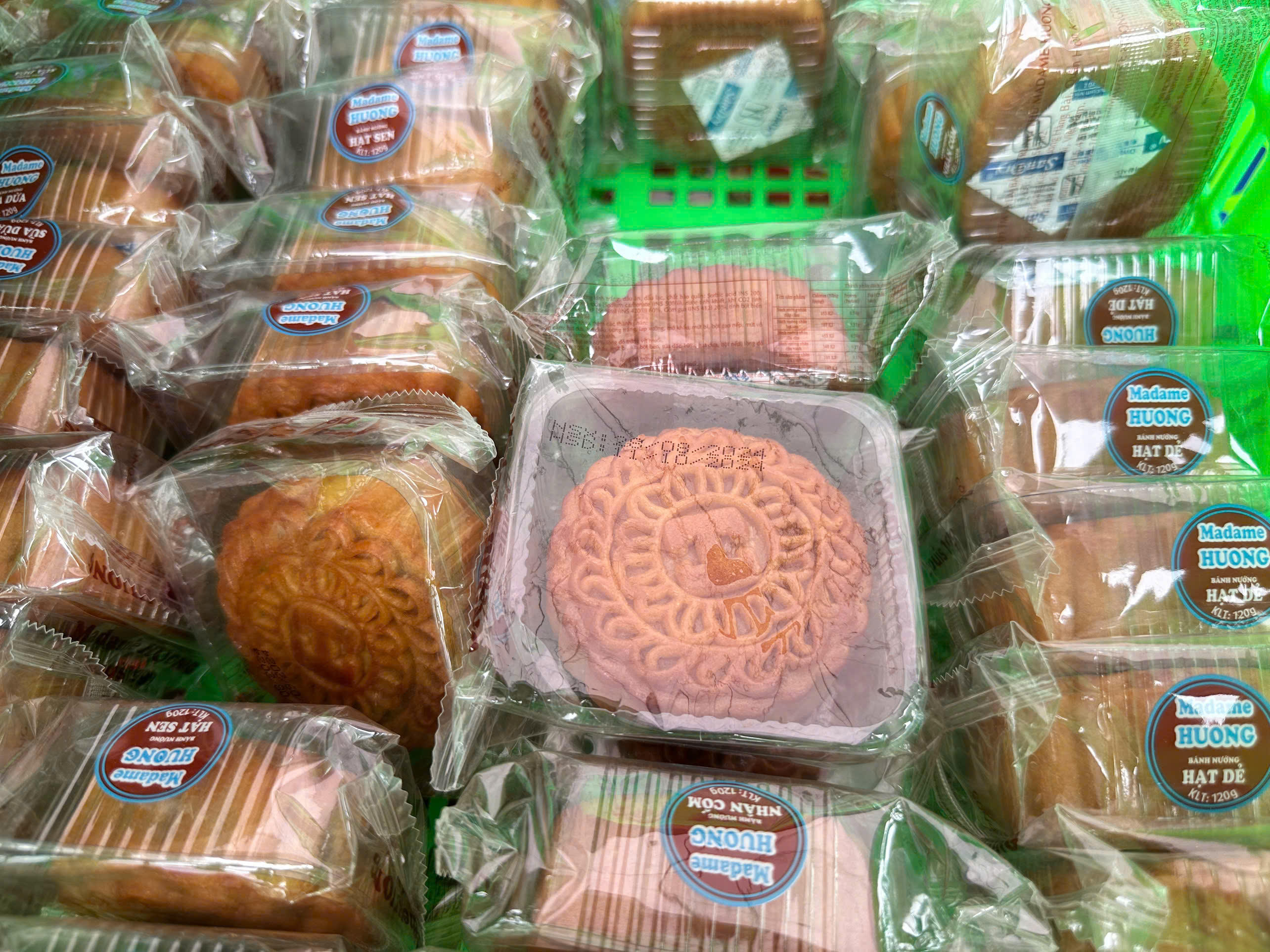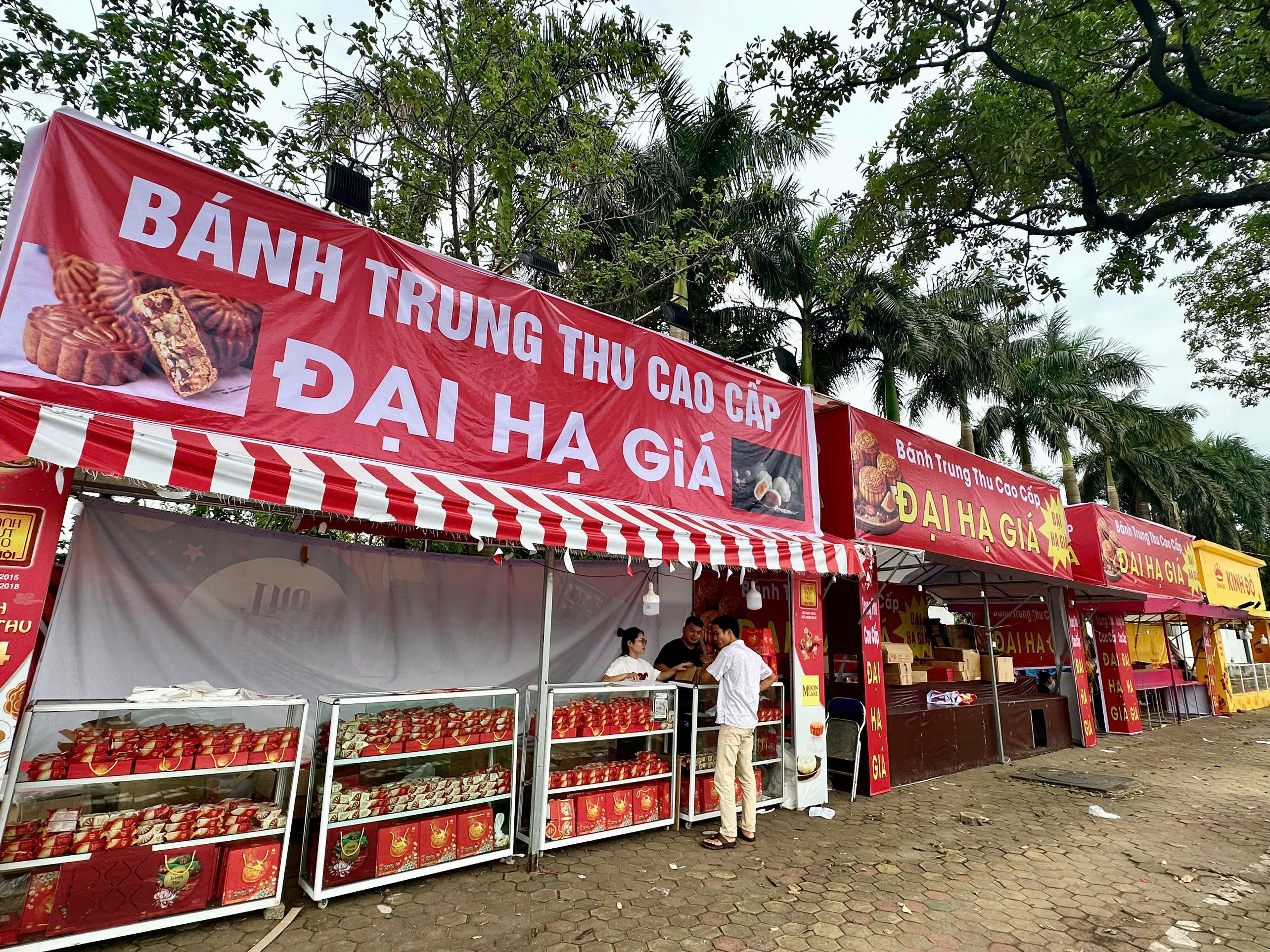 Tại một ki-ốt trên đường Lê Quang Đạo, hàng chục khay bánh Trung thu đầy được trưng bày với nhiều thương nổi tiếng hiệu khác nhau, cùng nhiều loại bánh như thập cẩm, đậu xanh, hạt dẻ, cốm, trứng chảy, trứng muối... Tất cả đồng giá là 100.000 đồng/3 chiếc. Nhiều chiếc bánh chỉ còn hạn sử dụng từ 2 - 3 ngày, song vẫn "nằm dài" chờ khách hàng tới mua.
