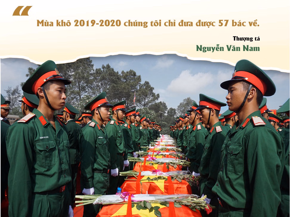 “Mùa khô 2019-2020 là một mùa khô đặc biệt bởi đây là thời điểm dịch Covid-19 bùng phát và hoành hành trên khắp thế giới. Chúng tôi cũng gặp không ít khó khăn cho nước bạn thực hiện các biện pháp cách ly. Thời gian tìm kiếm cũng bị rút ngắn lại gần 1 tháng so với kế hoạch do vậy kết quả không được như kỳ vọng. Mùa khô 2019-2020 chúng tôi chỉ đưa được 57 bác về”, Thượng tá Nguyễn Văn Nam - Đội trưởng Đội tìm kiếm, quy tập Nghệ An thông tin.