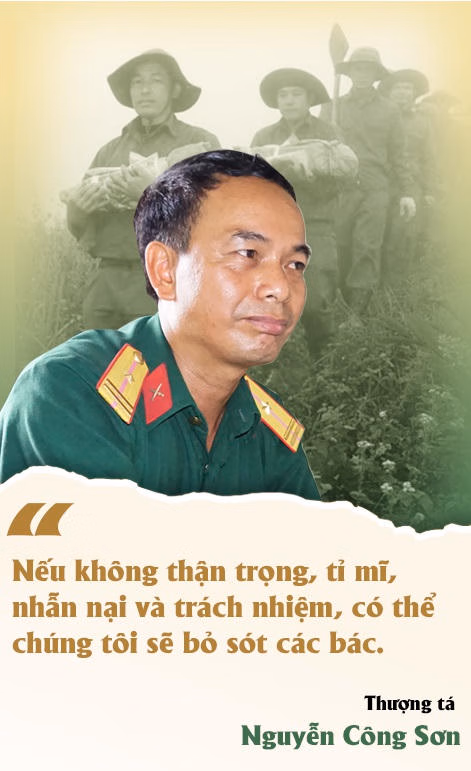 “Lúc này cũng đã trưa, anh em thấm mệt nên quyết định nghỉ. Bất giác tôi nhìn vào gờ đất giữa 2 huyệt mộ cũ, dù bề ngang rất nhỏ. “Thử đào xuống ở đây xem sao?”, tôi động viên anh em. Thật bất ngờ, ngay khoảng giữa 2 huyện mộ cũ là hài cốt của 1 bác. Cũng tại khu vực này, sau đó đội cũng tìm thấy 1 bác nữa, được chôn cất ở vị trí xiết góc so với các huyệt mộ cũ. Nếu không thận trọng, tỉ mỉ, nhẫn nại và trách nhiệm, có thể chúng tôi sẽ bỏ sót các bác. Cũng có những địa điểm chúng tôi phải quay lại tìm kiếm nhiều lần bởi dẫu chỉ có 1 thông tin nhỏ thôi cũng phải tìm cho bằng được. Để các bác ở lại bên đó là mình có tội với tiền nhân, với người thân của họ ở quê nhà”, Thiếu tá Nguyễn Công Sơn, nói.