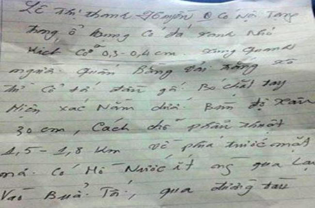 Nội dung của bức lạ ghi "Thi thể nạn nhân không có nội tạng, ổ bụng có đá xanh nhỏ kích cỡ 3 - 4cm, quanh người có quấn vải trắng xô từ cổ tới đầu gối bó chặt tay; hiện xác nằm dưới bùn độ sâu 30 cm cách chỗ phẫu thuật từ 1,5 - 1,8 km về phía trước mặt nơi có hồ nước ít người qua lại vào buổi tối. Tôi đã nhiều lần liên lạc để chỉ chỗ ném xác của nạn nhân nhưng không nhận được hồi âm".