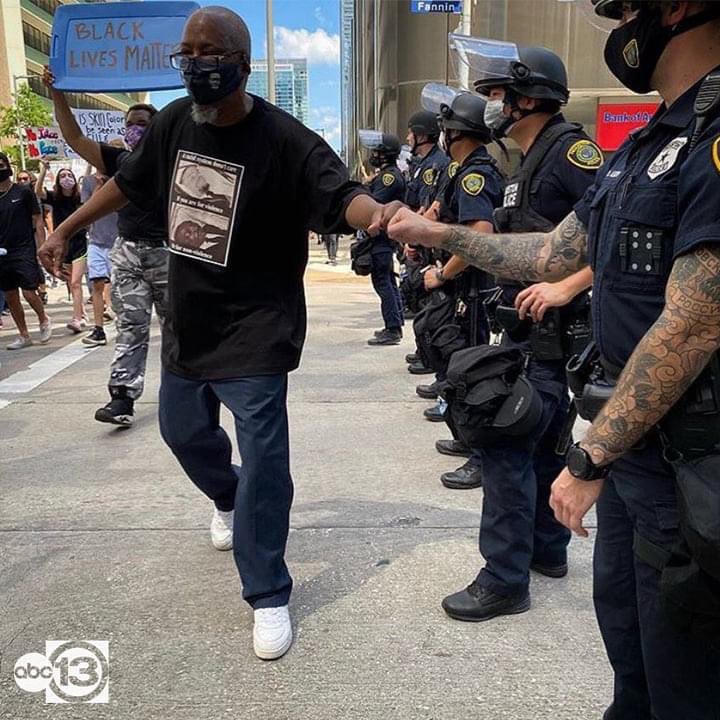 Trên Twitter, phóng viên Steve Campion của Đài ABC 13 đăng một bức ảnh kèm theo bài viết: "Bức ảnh khủng! Một người đàn ông tham gia biểu tình vì vụ George Floyd giơ nắm đấm chào một nhân viên cảnh sát Houston khi đang bước về hướng tòa thị chính".