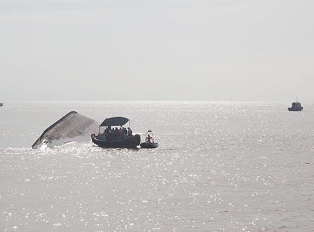 | Tàu cứu hộ không thể đến gần, lực lượng tìm kiếm phải dùng thuyền và ca nô nhỏ để đến khu vực tàu bị nạn |