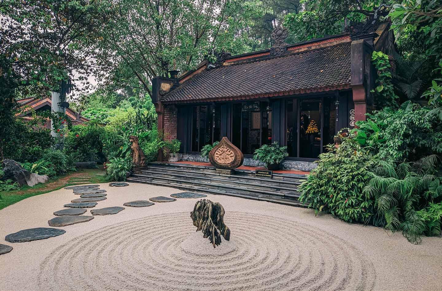Ngay trước khu Tổ đường, 12 vòng tròn được vẽ trên nền sỏi tượng trưng cho 12 nhân duyên của con người. Sỏi trắng mang ý nghĩa của sự thiền định. Ảnh: Vương Lộc