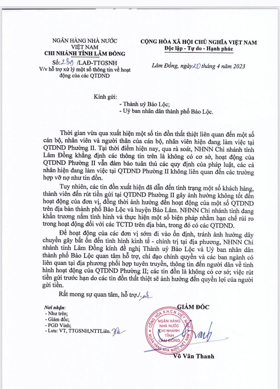 Liên quan đến sự việc trên, Ngân hàng Nhà nước (NHNN) Việt Nam Chi nhánh Lâm Đồng vừa có văn bản gửi Thành uỷ, UBND TP Bảo Lộc nêu rõ: Thời gian vừa qua, xuất hiện một số tin đồn thất thiệt liên quan đến một số cán bộ, nhân viên và người thân của cán bộ, nhân viên hiện đang làm việc tại Quỹ tín dụng nhân dân (TDND) phường II.