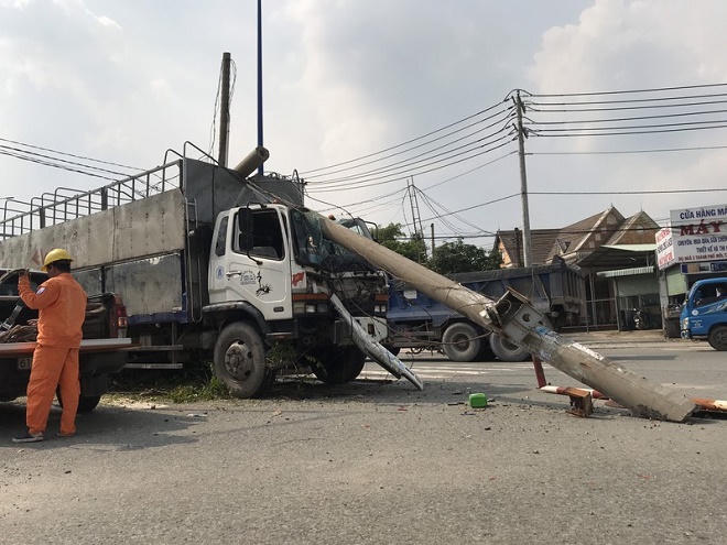 Vụ tai nạn khiến trụ điện bị gãy đôi, dây điện bị kéo đứt nằm ngổn ngang giữa đường điện. Khi vụ tai nạn xảy ra, hàng chục người điều khiển xe máy lưu thông trên đường hoảng sợ bỏ chạy, may mắn không ai bị thương.