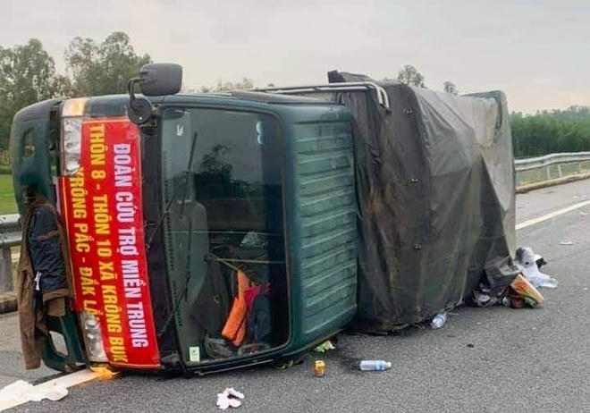 Tại hiện trường, xe tải mang biển số Đắk Lắk lật ngang, hàng hóa trên xe đổ xuống đường. Thời điểm gặp nạn xe tải đang chở hàng cứu trợ từ Đắk Lắk ra các tỉnh miền Trung thì gặp nạn. Sau vụ tai nạn, hàng hóa cứu trợ trên xe cũng được một số đoàn thiện nguyện bốc lên xe để tiếp tục hành trình.