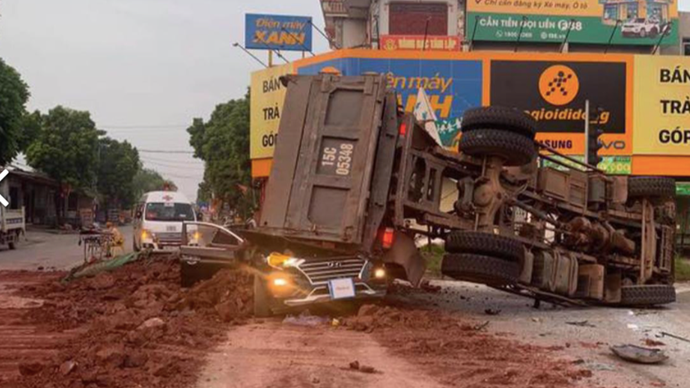 Xe chở đất bị lật đè lên xe con khiến 1 tài xế tử vong