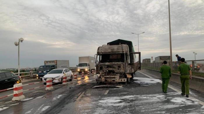 Theo Trung tá Nguyễn Anh Tuấn, bước đầu xác định xe container mang BKS 29C-950.8x- 29R-076.4x chở lúa do tài xế Nguyễn Đức Q (SN 1990, ở TP Việt Trì, tỉnh Phú Thọ) điều khiển cháy rụi hết phần đầu, tài xế đã kịp thời thoát ra ngoài.