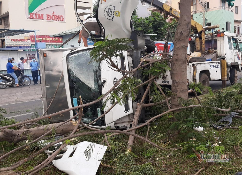 Xe tải "hạ gục" cây xanh lật nhào giữa đường, 2 người bị thương