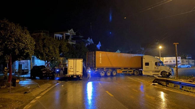 Cụ thể, khoảng 4h, xe đầu kéo BKS 15H-003.14, kéo sơmi rơmooc BKS 15R-034.88, do anh Nguyễn Sỹ Th (SN 1974, trú tại xã Quảng Thanh, huyện Thuỷ Nguyên, TP Hải Phòng) điều khiển, đi hướng Hạ Long - Móng Cái đã đâm vào xe ô tô 7 chỗ đi ngược chiều BKS 14A-428.75, do anh Nguyễn Văn T điều khiển.