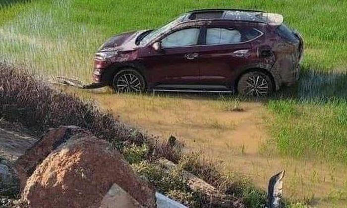Chiếc xe hư hỏng sau khi văng xuống ruộng. |