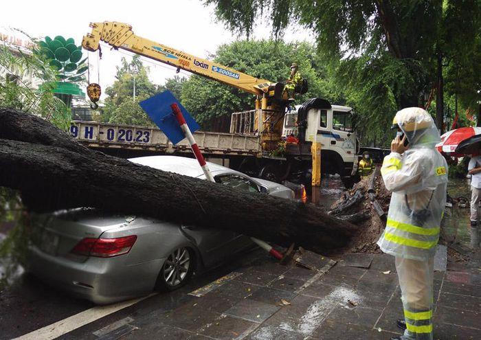 Khoảng 9h20, do mưa lớn kéo dài, một cây me cổ thụ trên phố Lý Thái Tổ, quận Hoàn Kiếm (Hà Nội) bất ngờ đổ xuống, đè lên 1 ô tô đang đỗ dưới lòng đường.