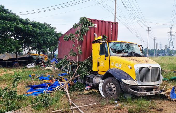 Tai nạn khiến anh H.M.T đang ngủ trong chòi bán nước tử vong, còn người vợ bị thương nặng. Tại hiện trường, quán bán nước bị sập, đồ đạc bị cán hư hỏng, vương vãi. Xe container dừng ở bãi đất trống, đầu xe bị móp, vỡ kính.