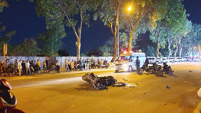 Tại hiện trường, hai xe máy biến dạng, dính vào nhau, một số mảnh vỡ văng xa hơn năm mét.
