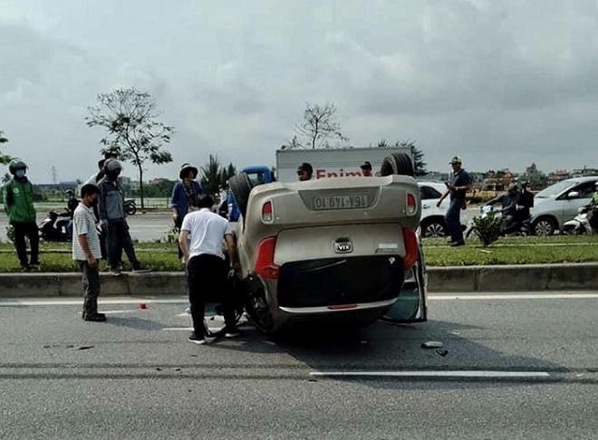 May mắn vụ tai nạn không có thiệt hại về người nhưng chiếc xe ô tô con bị lật ngửa, hư hỏng nằm giữa đường.