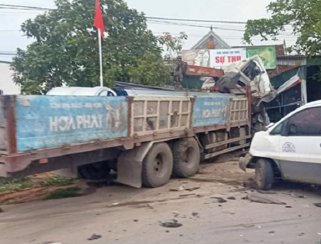 Cú va chạm mạnh khiến xe tải bị dập nát phần đầu, xe cẩu lao vào tông sập quán tạp hóa ven đường. Vụ tai nạn khiến 2 xe bị hư hỏng nặng, 2 tài xế bị thương.