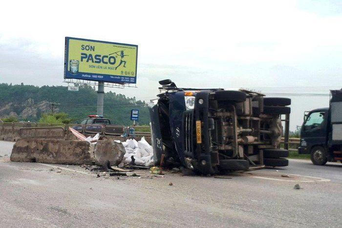 Tình huống bất ngờ này khiến tài xế mất lái, xe container bị lật nghiêng rồi ủi một đoạn dải phân cách trên quốc lộ 1A.