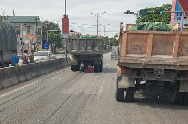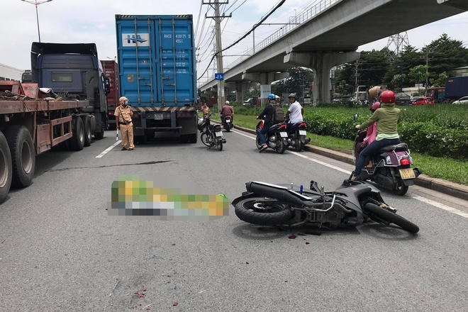 Sau đó, xe container tiếp tục đi khoảng 15m thì dừng lại. Tại hiện trường, chiếc xe máy và nạn nhân nằm trên làn xe 2 bánh, cách đó vài chục mét là chiếc container gây tai nạn..