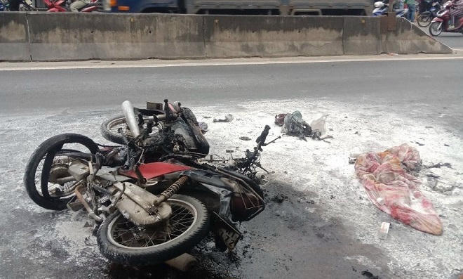 Sau cú va chạm mạnh, 2 chiếc xe máy bốc cháy ngùn ngụt khiến một người bị bỏng nặng, người còn lại bị thương. Phát hiện vụ việc, người dân gần đó chạy đến dập lửa để cứu nạn nhân và đưa vào bệnh viện.