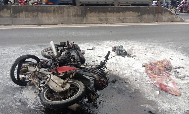 Hai xe máy va chạm bốc cháy ngùn ngụt, 1 người bỏng nặng