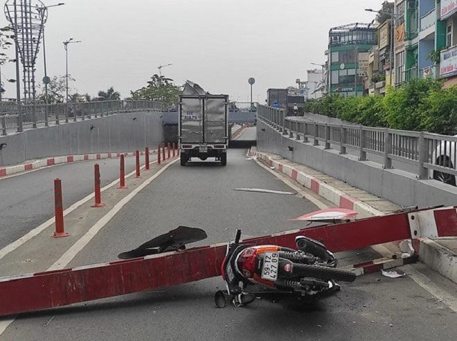 Vụ va chạm làm cho thanh barie rơi xuống đường, vừa đúng lúc này, đôi nam nữ chở nhau trên chiếc xe máy BKS: 59T2-427.09 đang chạy phía sau tới đã bị thanh barie va trúng.