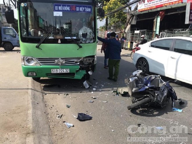 Khi còn cách giao lộ Phạm Huy Thông khoảng 100m (giáp ranh giữa phường 7 và phường 5, quận Gò Vấp), xe máy tông trực diện vào đầu xe buýt tuyến 146 đang chạy hướng ngược lại.