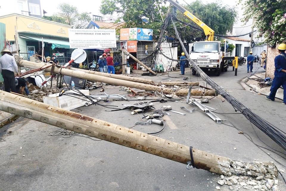 Khi cách đường Trần Ngọc Diện khoảng 500 m, ôtô này bất ngờ lao lên lề đường, tông gãy một cột điện trung thế. Chiếc xe tiếp tục lao về trước, kéo đổ thêm 4 cột điện rồi mới dừng lại.
