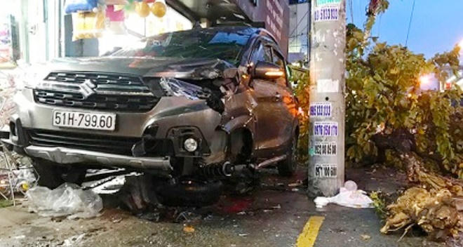 Khi đến gần giao lộ Nguyễn Ảnh Thủ-Tô Ký, phường Trung Mỹ Tây, quận 12, TP Hồ Chí Minh, xe 7 chỗ bất ngờ tông 3 xe máy trên đường. Chưa dừng lại, xe 7 chổ lao lên vỉa hè tông gãy một cây xanh trước khi lao vào 2 cửa hàng buôn bán ở đây.