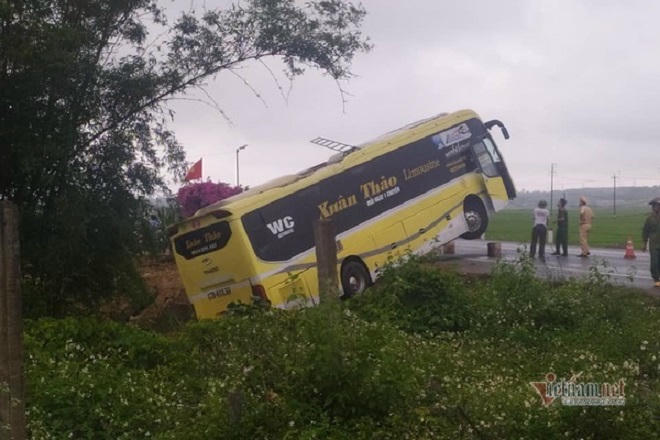 Tại hiện trường, phía đuôi xe khách rơi xuống rãnh sâu, phần đầu xe vắt lên đường.