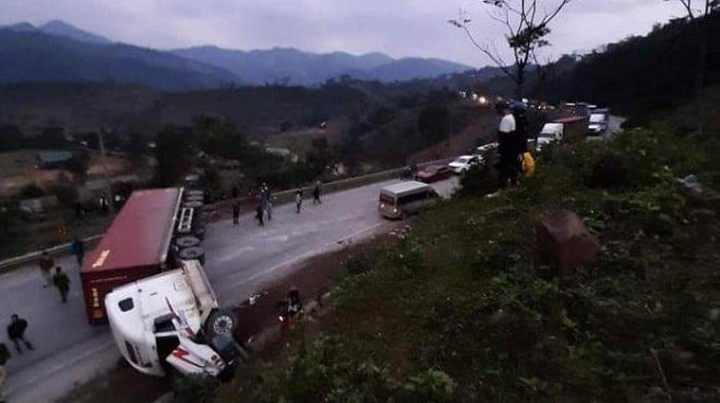 Container lật nghiêng giữa đường