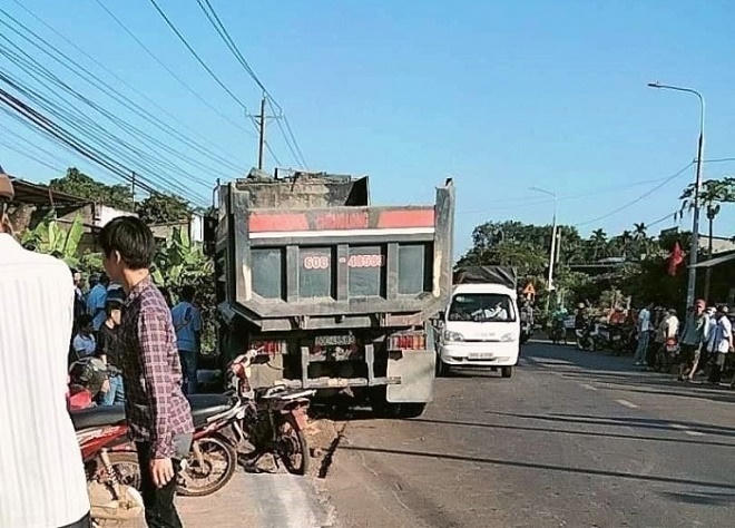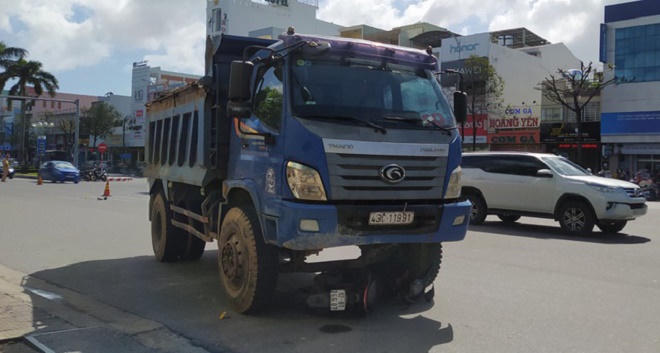 Cú tông khiến nạn nhân cùng xe máy bị cuốn vào gầm xe. Chị Lành tử vong, xe máy tiếp tục bị xe tải kéo lê hơn 50m mới dừng lại.