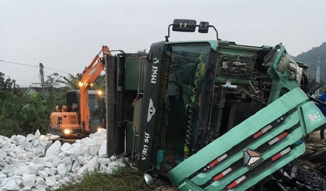 Xe tải chở đá trắng bị lật, đường sắt Bắc - Nam tê liệt