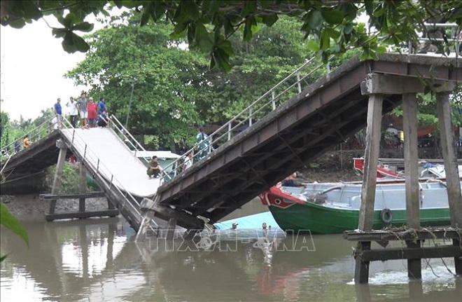 Chiếc ghe tải trọng 50 tấn chở lúa lưu thông trên sông bất ngờ tông sập một cây cầu ở huyện Lai Vung, tỉnh Đồng Tháp.
