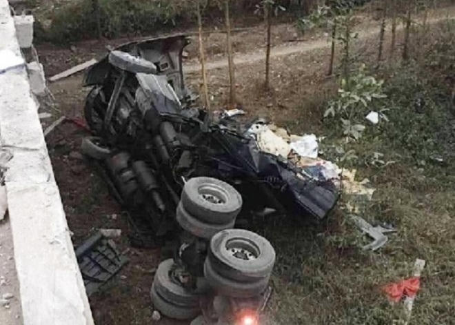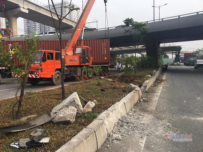 Vụ tai nạn khiến anh Quang và anh Hà bị thương được người dân đưa đi cấp cứu tại bệnh viện. Tại hiện trường, chiếc xe container bẹp dúm, hư tại nặng, hàng hóa từ thùng xe văng ra dưới chân cầu.