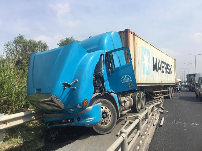 Còn tại TP HCM, khoảng 11h, xe đầu kéo BKS 51C - 208.06 kéo theo rơ-mooc chở container loại 40 feet lưu thông trên đường dẫn cao tốc TP.HCM - Long Thành - Dầu Giây (hướng từ quận 9 về quận 2). Khi vừa qua khỏi cầu Mương Kênh 200 mét (thuộc phường An Phú, quận 2, TP HCM) thì bất ngờ lao qua phải, tông vào dải phân cách bằng sắt.
