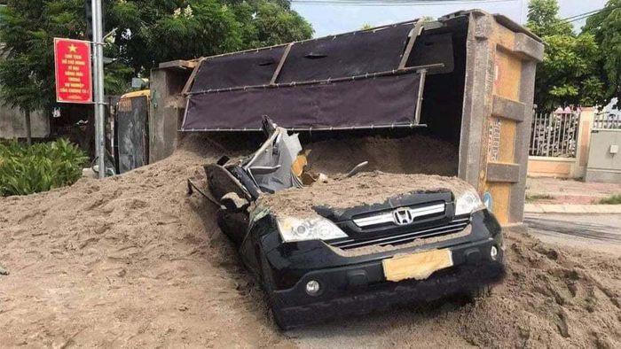 Bị xe tải lật nghiêng đè nát xe con, tài xế may mắn thoát nạn
