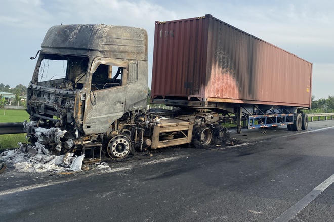 Cũng tại Long An, khoảng 5h trên cao tốc TP HCM - Trung Lương, đoạn qua xã Thạnh Đức, huyện Thủ Thừa xảy ra vụ 2 xe container bốc cháy.