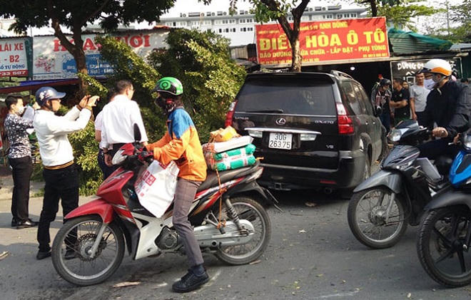 Tại hiện trường, chiếc xe Lexus biển kiểm soát 30G-263.75 nằm quay ngang, chắn dòng phương tiện lưu thông từ đường Trần Thái Tông về Cầu Giấy.