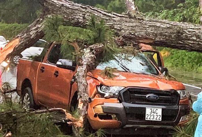 Chiều 27/8, ôtô bán tải do anh Vũ Như Hợp (SN 1986, ngụ tại TP Đà Lạt, tỉnh Lâm Đồng) điều khiển chở theo vợ, con và người em vợ di chuyển trên đường Trần Quốc Toản, TP Đà Lạt thì bất ngờ bị một cây thông cổ thụ gãy đổ đè ngang xe.