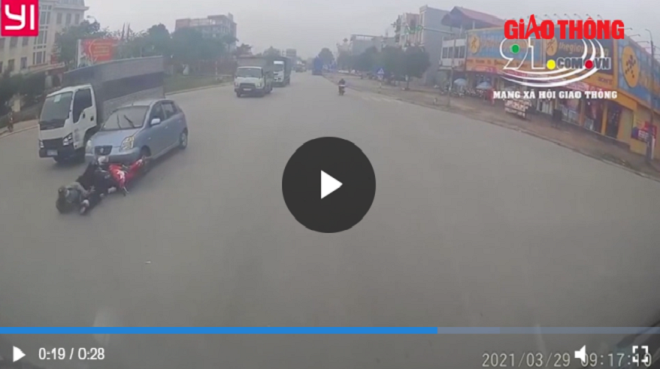 Theo đoạn clip ghi lại, đôi nam nữ điều khiển xe máy khi rẽ sang đường thiếu quan sát, chạy cắt đầu xe tải. Đúng lúc này chiếc xe 4 chỗ đi cùng chiều đã không xử lý kịp tông tông trúng xe máy khiến 2 người trên xe máy ngã ra đường.