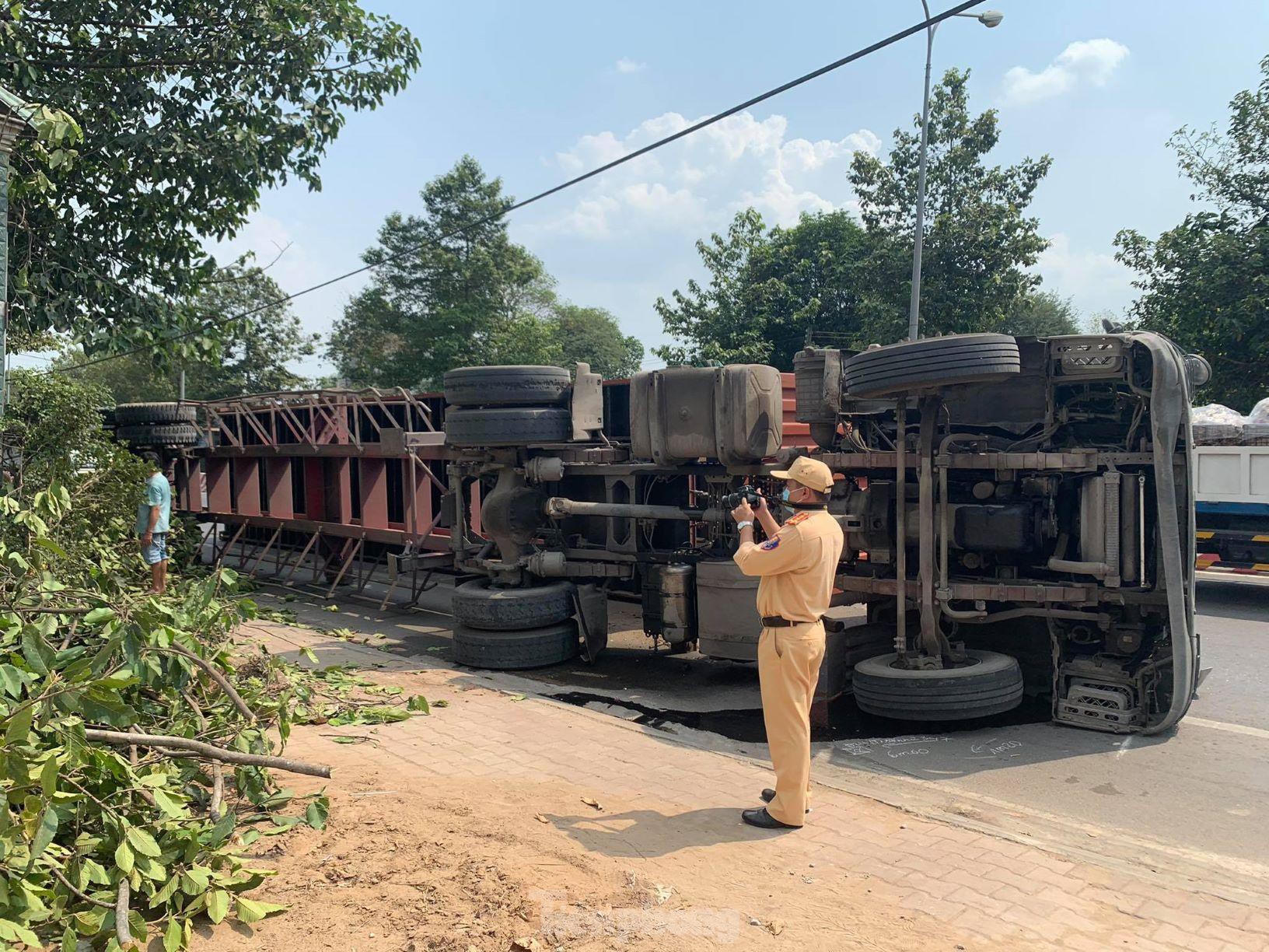 Thời điểm trên đầu kéo container mang BKS 61C-140.93 lưu thông đến đây thì bất ngờ lao lên vỉa hè tông gãy cây xanh lật nghiêng, thùng container văng xuống đường. May mắn thời điểm trên không có phương tiện nào đi qua nên không bị vạ lây.