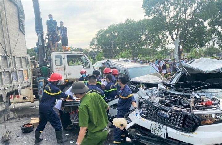 Các xe đâm liên hoàn là xe tải, ô tô con, xe bán tải. Toàn bộ 9 xe đều bị hư hỏng nặng. Vụ tai nạn làm một người trên ô tô BKS 29H-467.21 tử vong, ngoài ra có ít nhất 2 người đi trên xe khác bị thương.