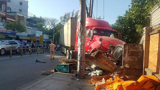 Chiếc xe container chỉ dừng lại khi tông sập phần tường rào bằng bê tông của một công ty bên đường.